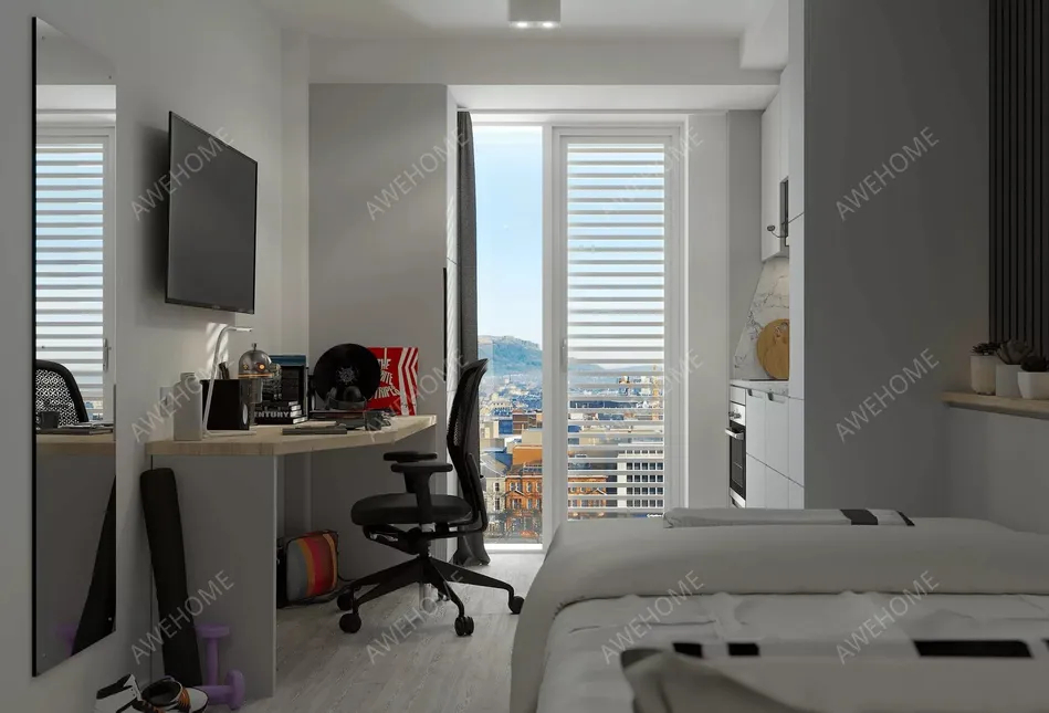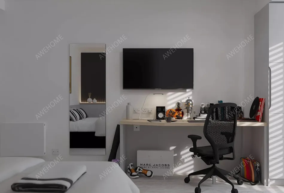 Instalaciones del dormitorio: armario, silla, mesa, espejo, ventana, cama, cómoda para ropa, baño privado, lámpara, ventana panorámica, papelera, colchón, televisor, estantería, armario de almacenamiento, mesita de noche, cortinas, lámpara de escritorio.