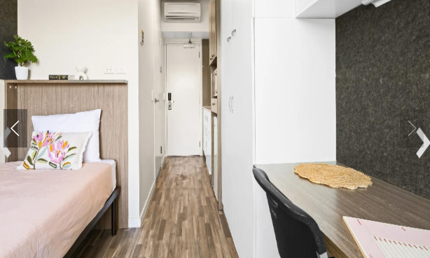 ▪ El residencial ofrece distintos tipos de alojamiento: estudios, habitaciones dobles y cuádruples, entre otros, para que elijas según tus necesidades. Todas las habitaciones cuentan con aire acondicionado y están completamente amuebladas: cama grande, colchón, armario y espacio de almacenamiento; además, incluyen utensilios de cocina, mesa y sillas. Cada habitación dispone de conexión WiFi.