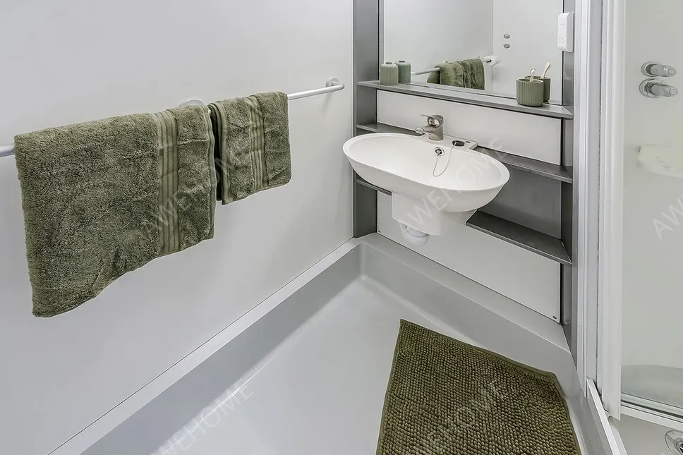 Instalaciones del baño: ducha de mano, lavabo, cabina de ducha, fregadero, rociador, inodoro.