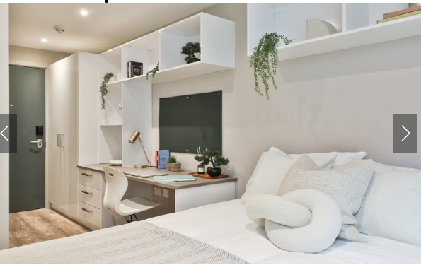 1. El apartamento ofrece habitaciones En-suite (baño privado y cocina compartida) y estudios (baño y cocina privados), diseñados especialmente para estudiantes. Todas las habitaciones cuentan con cobertura WiFi completa y espacio suficiente para almacenamiento. Cada habitación está equipada con instalaciones básicas: cama (con colchón), armario, escritorio y silla. Las cocinas comunes también están completamente equipadas.