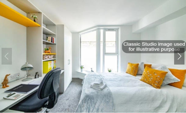 Foundry Studios, opened in 2021, offers one twin room and five studio options (each with private bathroom and private kitchen). Kitchens are equipped with fridge, hob, microwave, and oven, plus dining area and ample storage space. Additional facilities include a cinema room, study room, games room, bicycle storage area, outdoor courtyard, and a dedicated laundry room — all designed to support students’ academic and daily life needs.