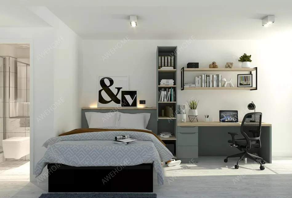 Instalaciones del dormitorio: armario, silla, mesa, espejo, ventana, cama, cómoda para ropa, baño privado, lámpara, ventana panorámica, papelera, colchón, televisor, estantería, armario de almacenamiento, mesita de noche, cortinas, lámpara de escritorio.