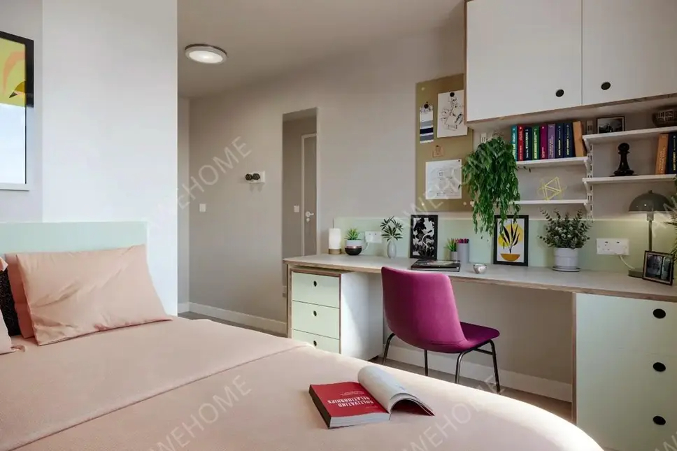 Instalaciones del dormitorio: cama, mesa, silla, armario