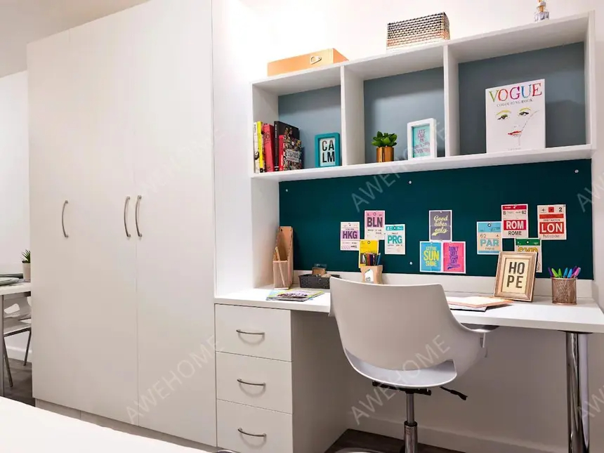 Instalaciones del dormitorio: estantería, ventana, mesa, cama, colchón, baño privado, espejo, silla, armario